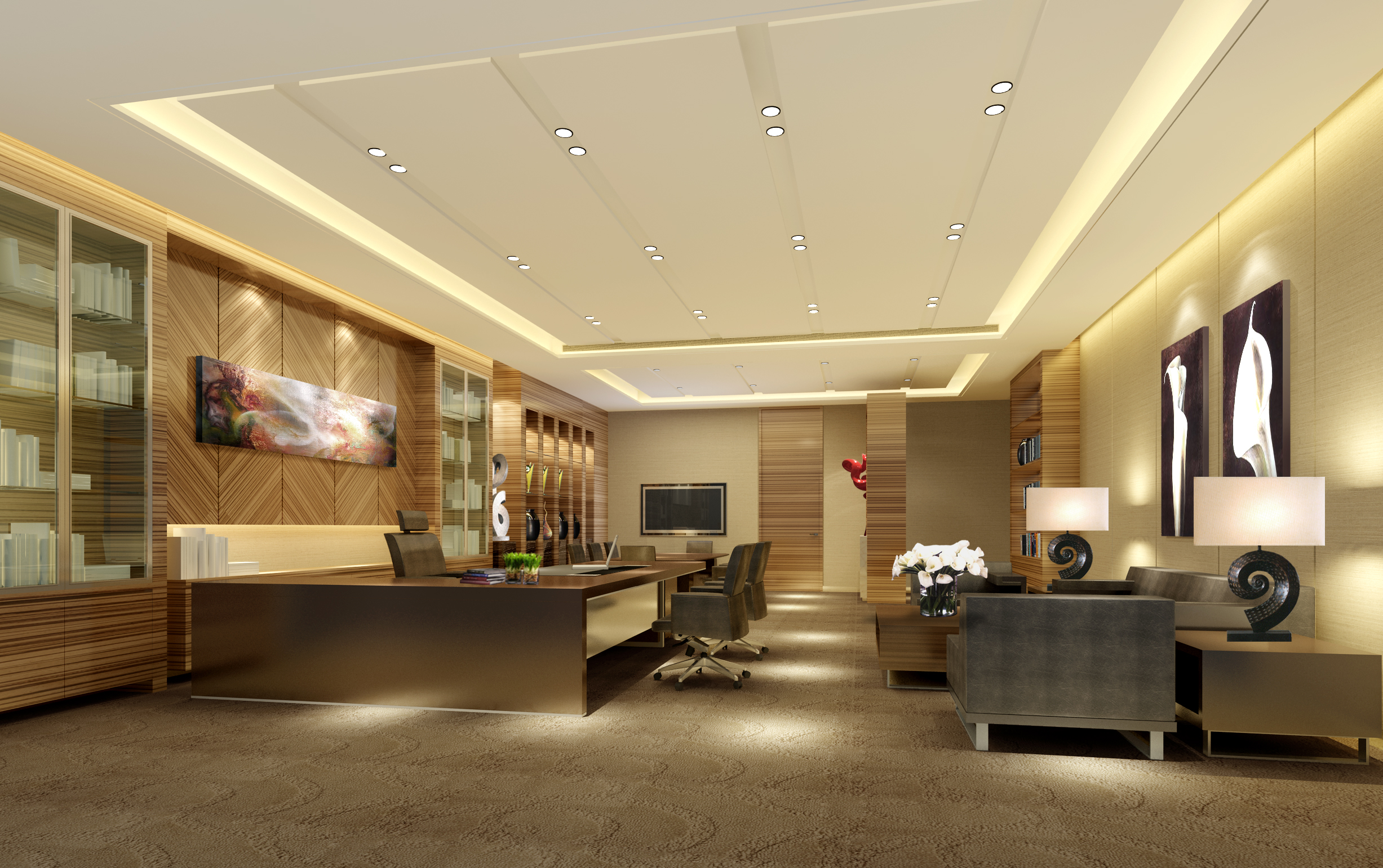 2、經理辦公室照明要考慮寫字臺的照度、會客空間的照度及必要的電氣設備。