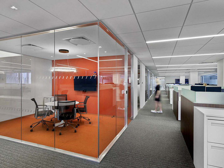 兩個樓層沿周邊設計的辦公室均采用通透的玻璃隔墻,即帶來充足的室內采光,也彰顯了公司所倡導的透明與連接的文化。