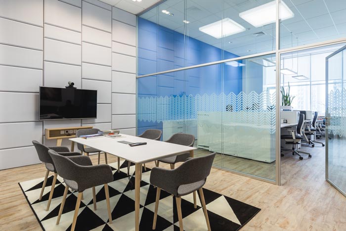 辦公室裝修設計會議室:此次位于辦公區域的一邊,這樣設計也是受到空間面積的限制,在玻璃隔斷上設計師采用了隔音玻璃,目的就是為了保證會議的正常運行,空間布局簡單、便捷,讓員工在這樣的空間中可以自由發揮,在設計師看來會議的開展正該如此。